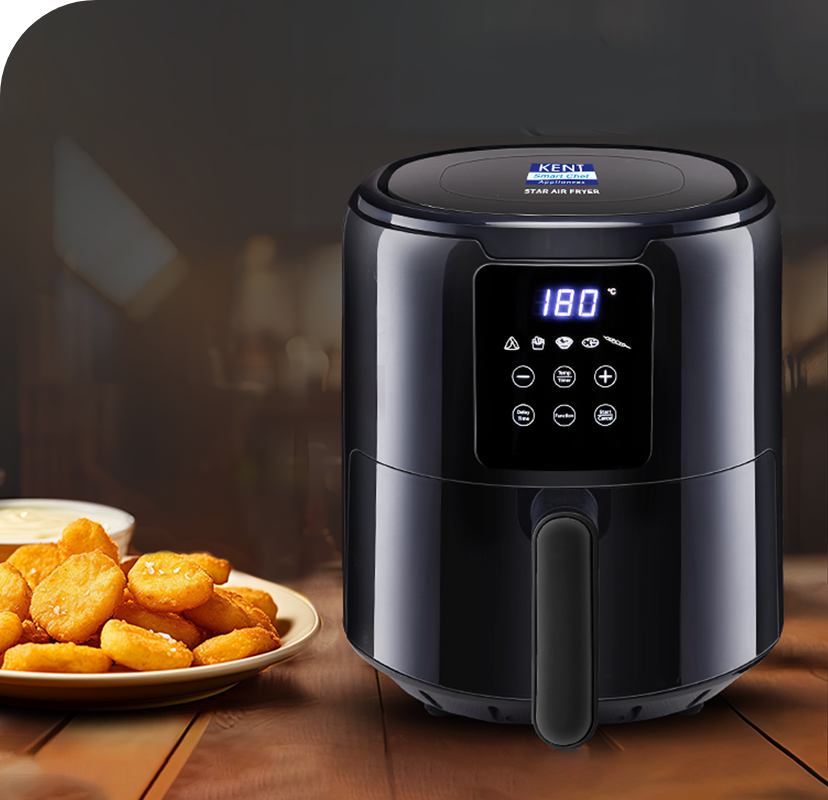 With the KENT Star Air Fryer, you can indulge in mouth watering fried delicacies like samosas, fries, frozen meals, pizza, and kebabs without having to worry about consuming too much fat. While maintaining the same crispiness, taste, and texture of traditional deep-frying, this gadget uses up to 80% less oil.