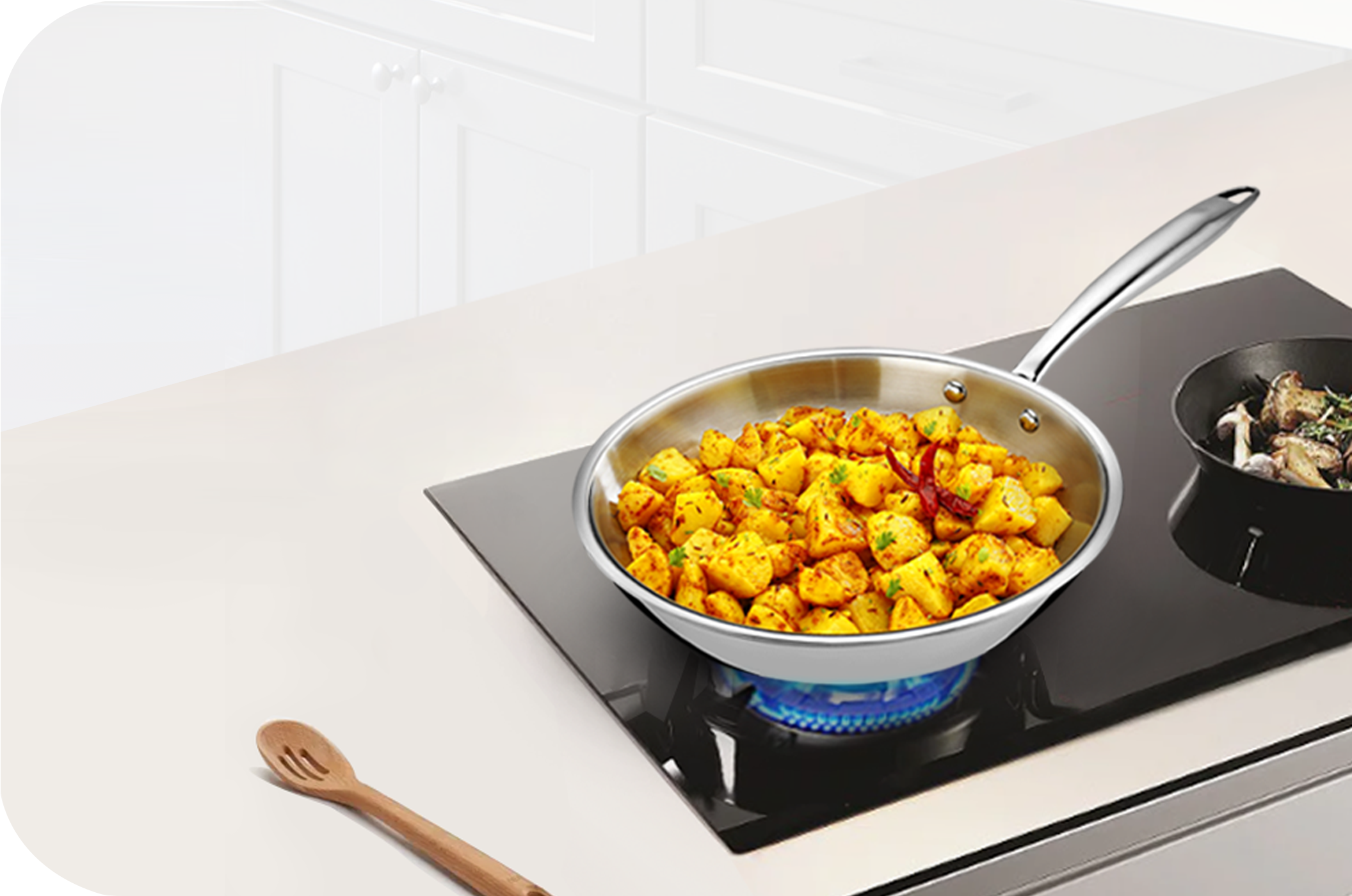 KENT Tri-Ply Kadai Wok has a triple base construction with aluminium layer sandwiched in middle for uniform heat distribution. This also results in preventing food from burning and sticking.