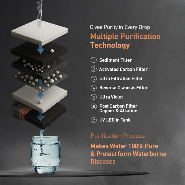 Multiple Purification Process of RO+UV+UF+Alkaline+ Copper+TDS Control ensures 100% pure water